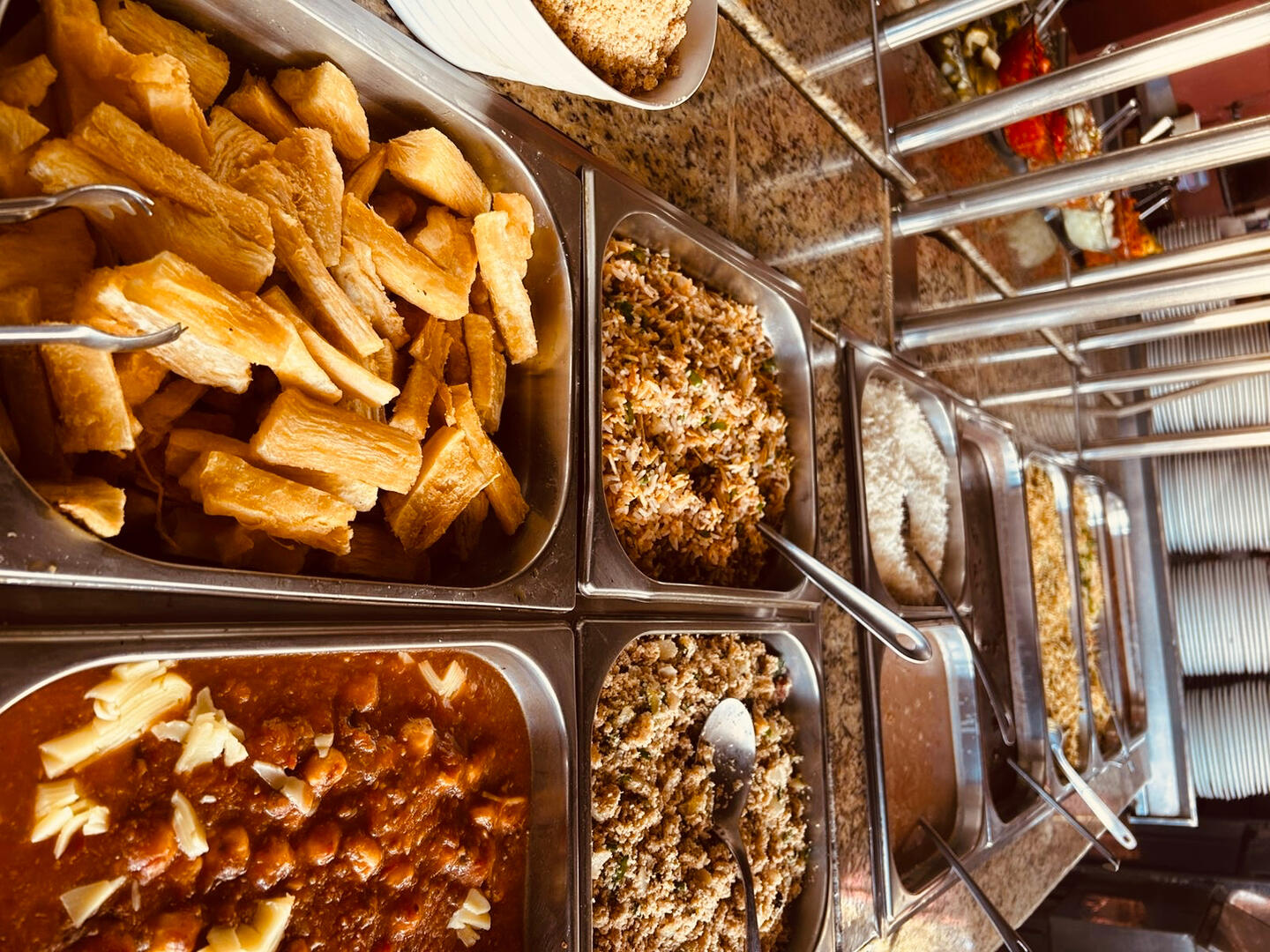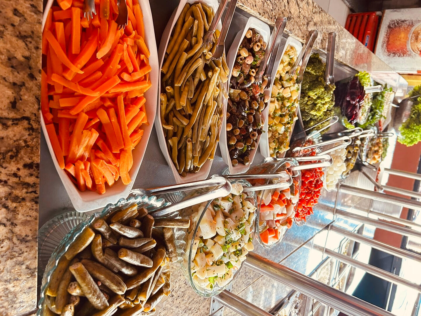 Almoço completo, carnes assadas, saladas frescas e massas deliciosas – self service à vontade!